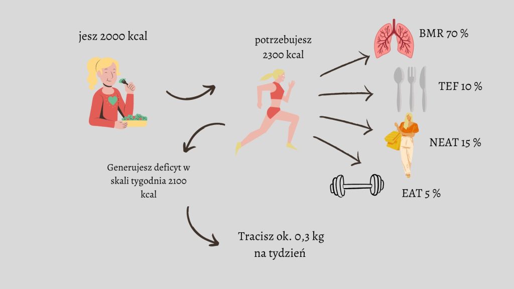2. Zmniejszeniem zapotrzebowania energetycznego i spowolnieniem metabolizmu- spadek masy ciała przyczynia się do zmniejszenia PPM i jest to normalny skutek, natomiast deficyt kaloryczny prowadzi do dużego spadku NEAT w ciągu dnia (ciało nie ma energii być ruchliwe i oszczędza się na każdym kroku- coś w stylu, że intuicyjnie będziesz szukać miejsca, żeby usiąść, gdy możesz w zasadzie stać itd.). W ogólnym rozrachunku zbyt długi deficyt to spowolnienie metabolizmu, czyli adaptacja metaboliczna w celu oszczędzania jak najwięcej energii (twoje ciało myśli, że jest głód na świecie i uwierz mi, to jest naprawdę mądre).