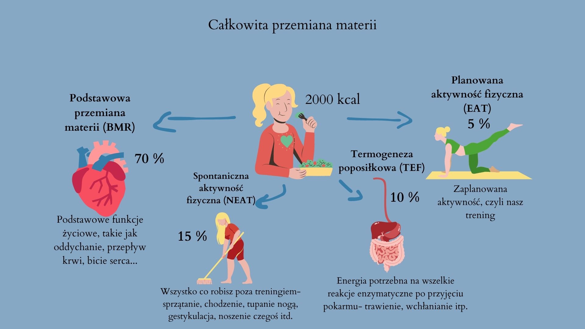 Bardzo upraszczając, do prawidłowego funkcjonowania organizmu potrzebujemy: energii do podtrzymania wszystkich funkcji życiowych- jest to podstawowa przemiana materii, a także energii do wykonywania różnych zadań w ciągu dnia (przemieszczanie się, aktywność fizyczna, obowiązki i wszystko inne) – jest to ponadpodstawowa przemiana materii. Razem te wydatki energetyczne stanowią całkowitą przemianę materii.