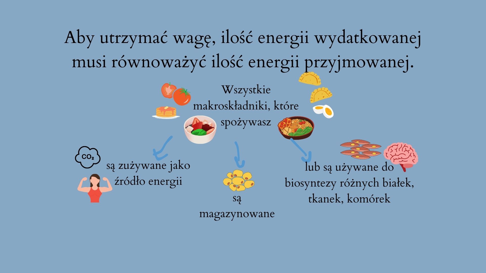 Aby utrzymywać swoją masę ciała, energia, którą wydatkujesz musi równoważyć energię, którą spożywasz. W zależności od równowagi tych dwóch, spożyte kalorie mogą być albo zamieniane w energię, magazynowane w tkance tłuszczowej albo zużywane do biosyntezy białek, hormonów, tkanek i mięśni.