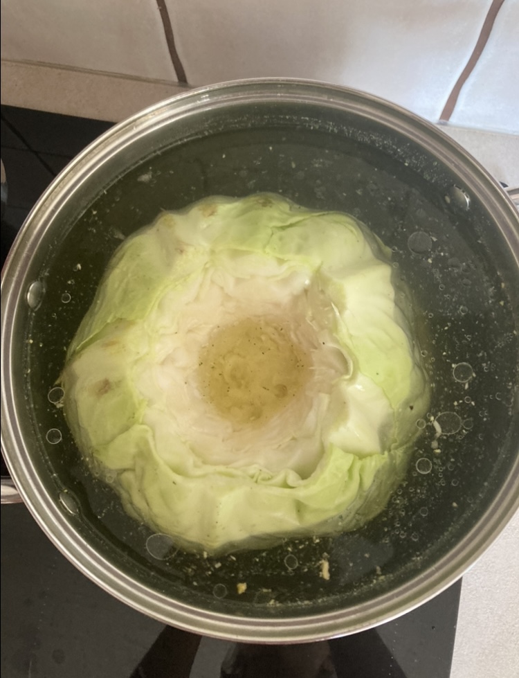 - Na tyle na ile możesz, wytnij od dołu zgrubienie kapusty (resztę ewentualnie wytniesz przy pojedynczych liściach) i włóż ją do dużego garnka z wodą i opcjonalnie łyżeczką wegety, tak aby cała kapusta była przykryta wodą.