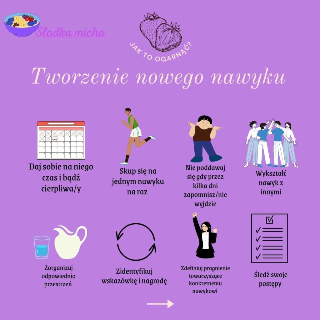 Stworzyłam grafikę, na której wymieniłam na podstawie badań i książki “Siła nawyku” najważniejsze aspekty, na które warto zwrócić uwagę podczas tworzenia nowego nawyku.